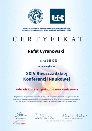 - CERTYFIKAT dr n.med. Rafał Cyranowski uczestniczył w III Zjeździe Polskiego Towarzystwa Artroscopowego, który odbył się w dniach 24-26 października 2019r w Katowicach.