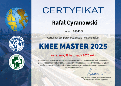 - 29 listopada 2025 – Uczestnik sympozjum Knee Master 2025r. – Hotel Mercure Warszawa Centrum