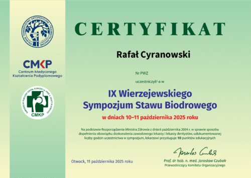 - Certificate of Attendance, MD Rafał Cyranowski atended the ,,Ist International Congres of Polish Society of Arthroscopic Surgery”